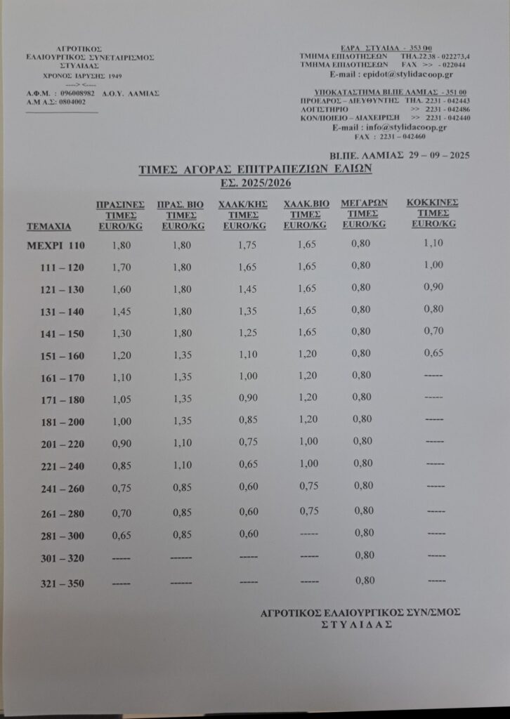 Ο Αγροτικός Ελαιουργικός Συνεταιρισμός Στυλίδας ανακοίνωσε τιμές αγοράς για επιτραπέζιες ελιές, εσοδείας 2025/2026.