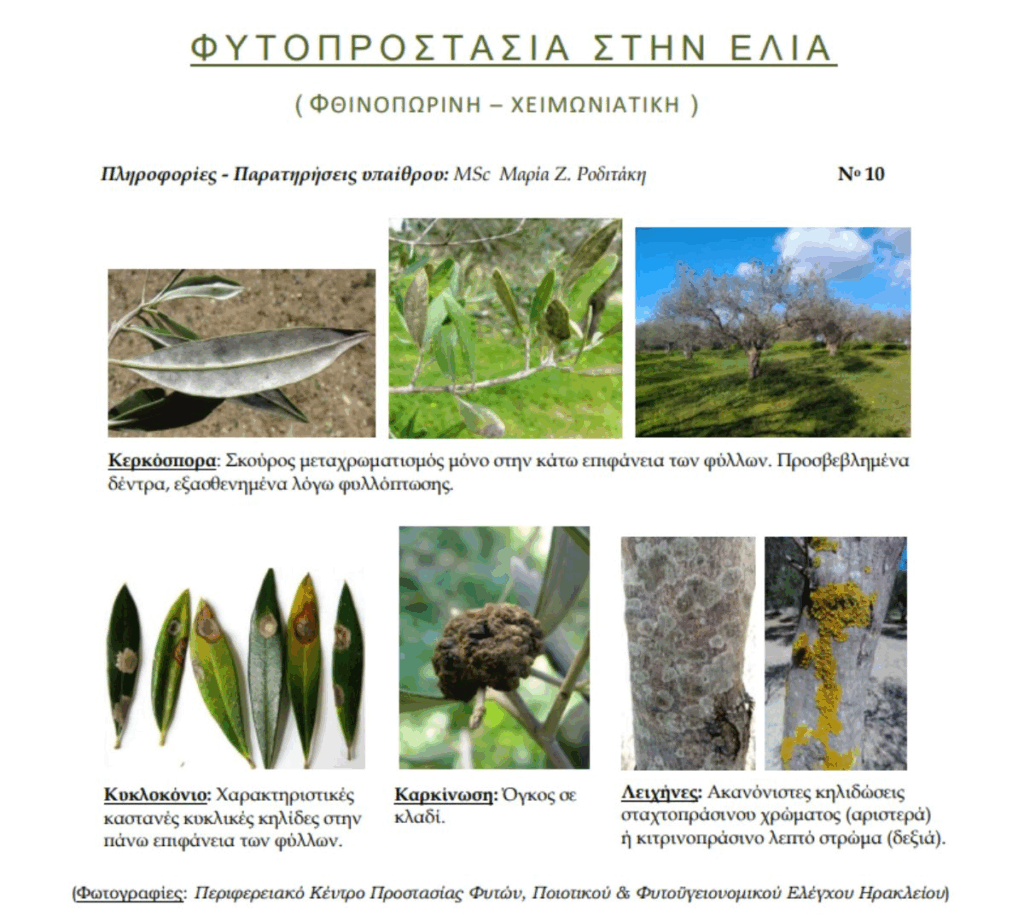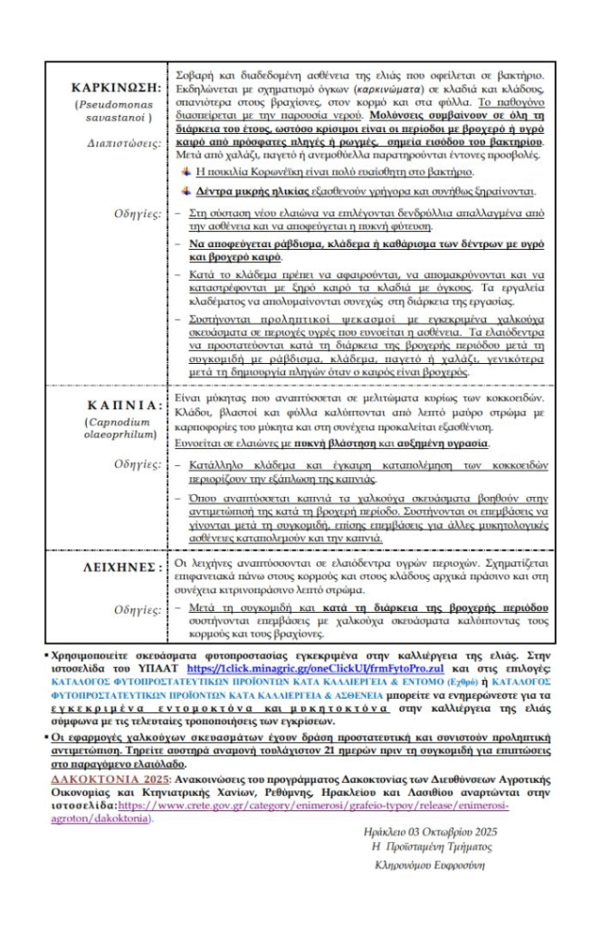 Από τη Διέυθυνση Ποιότητας και Ασφάλειας Τροφίμων και το Κέντρο Προστασίας Φυτών, Ποιοτικού και Φυτοϋγειονομικού Ελέγχου Ηρακλείου εκδόθηκε Τεχνικό Δελτίο Γεωργικών Προειδοποιήσεων για την καλλιέργεια της Ελιάς.