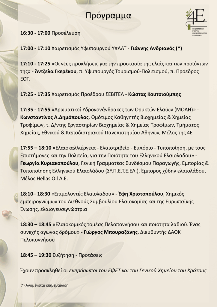 Η Επιστημονική Εταιρεία Εγκυκλοπαιδιστών Ελαιοκομίας (4Ε) διοργανώνει ενημερωτική εκδήλωση με θέμα: