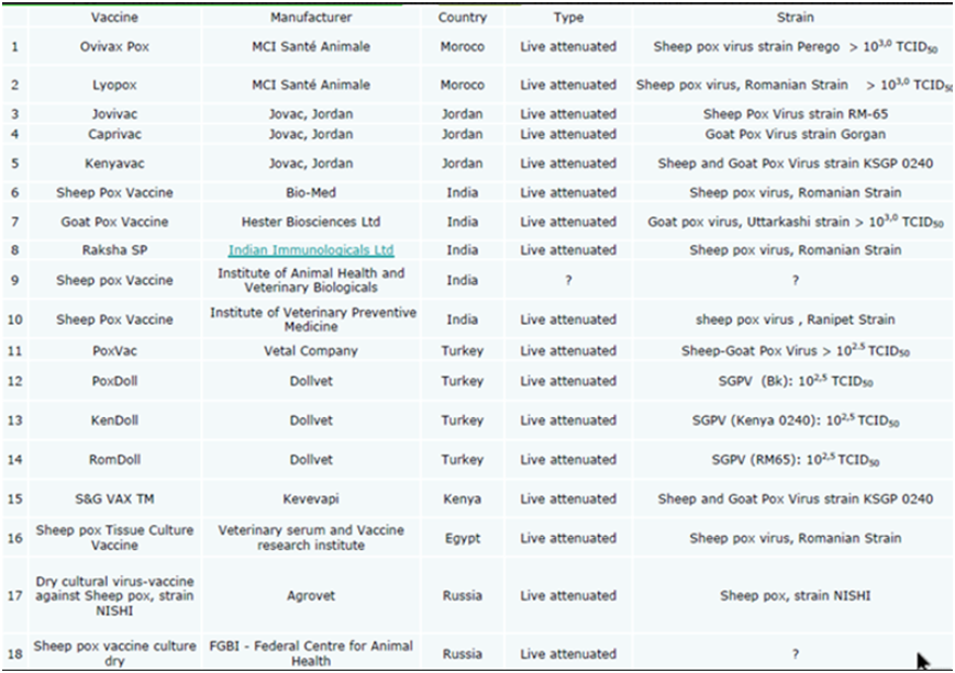 - Η εισαγωγή εμβολίων της ευλογιάς των αιγοπροβάτων είναι παράνομη, καθώς δεν έχει εγκριθεί οποιοδήποτε σχετικό σκεύασμα. Σύμφωνα με τον Νόμο 5184/2025 (ΦΕΚ Α’ 34/06.03.2025), ένα σκεύασμα (όπως το εμβόλιο της ευλογιάς) θεωρείται παράνομο και η διακίνησή του επιφέρει κυρώσεις όταν διατίθεται με οποιονδήποτε τρόπο χωρίς την άδεια κυκλοφορίας που απαιτείται από την κείμενη νομοθεσία. Στη χώρα μας, δεν έχουν εγκριθεί-αδειοδοτηθεί κτηνιατρικά ανοσολογικά σκευάσματα (εμβόλια) για την ευλογιά. Στην εικόνα 3 υπάρχει κατάλογος εμβολίων ευλογιάς που χρησιμοποιούνται σε τρίτες χώρες.