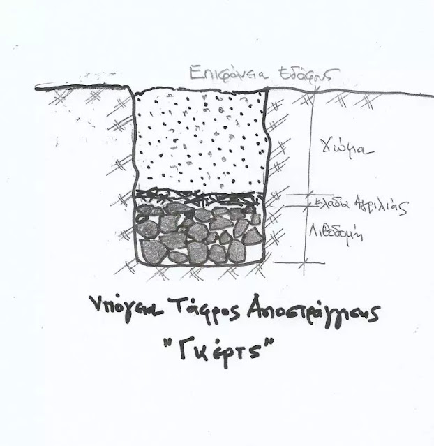 Με τον τρόπο αυτό τα επιφανειακά νερά περνούσαν από την πλημμυρισμένη επιφάνεια του εδάφους στον βυθό της σκεπασμένης τάφρου και μέσα από τα κενά που υπήρχαν ανάμεσα στις τοποθετημένες πέτρες, εκβάλλονταν στον αποδέκτη. Έτσι όσα νερά δεν μπορούσε να απορροφήσει πλέον η κορεσμένη γη, απομακρύνονταν, με συνέπεια να ανασαίνει το ριζικό σύστημα των δέντρων ή των σπαρτών.
